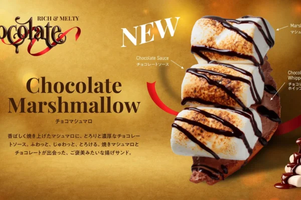 『チョコマシュマロ』は、香ばしく焼き上げたマシュマロに、濃厚なチョコレートソースを重ねた一品です。外側の香ばしさと内側のふんわりとした食感が特徴で、一口噛むごとに広がる優しい甘さとチョコレートの深いコクが調和します。揚げサンドでありながら、デザートとしての完成度を追求しており、「ふわっ・じゅわっ・とろっ」という新しい食感体験を提供します。価格は950円(税込)です。