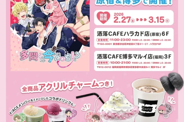 2026年2月27日(金)より、TVアニメ『多聞くん今どっち!?』と洒落CAFEのコラボレーションカフェが、東京・原宿の洒落CAFEハラカド店および福岡・博多の洒落CAFE博多マルイ店の2店舗にて同時開催されます。本イベントでは、作品の世界観や登場キャラクターをイメージしたオリジナルメニューの提供に加え、限定特典や豪華なセットメニューが用意されており、ファンにとって特別な体験が提供される予定です。