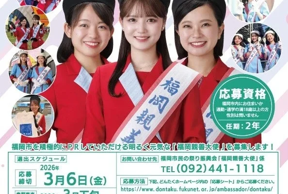 今回募集されるのは、2026年5月2日の博多どんたく港まつり前夜祭から2年間活動する、新たな福岡親善大使3名です。応募期間は2026年1月19日(月)から3月6日(金)までと設定されており、福岡への深い愛情と、その魅力を積極的に伝えたいという意欲を持つ方々からの応募を広く募っています。