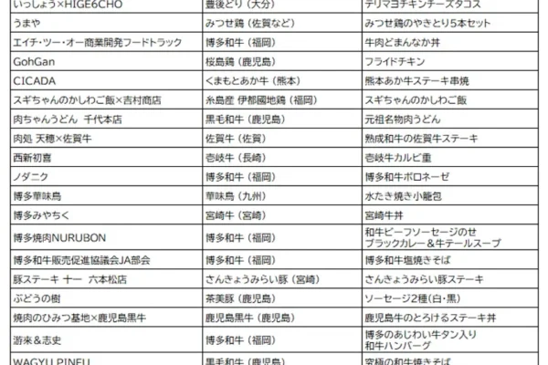 具体的なメニューとしては、「テリマヨチキンチーズタコス」「みつせ鶏のやきとり5本セット」「牛肉どまんなか丼」「熊本あか牛ステーキ串焼」「熟成和牛の佐賀牛ステーキ」「壱岐牛カルビ重」「宮崎牛丼」「鹿児島牛のとろけるステーキ丼」などが予定されています。各出店店舗のメニューと価格の詳細は、以下の画像をご参照ください。
