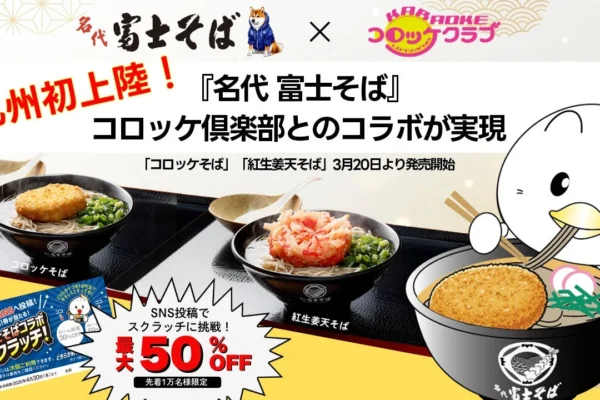 関東で絶大な支持を集める立ち食いそばチェーン「名代 富士そば」が、2026年3月20日より九州に初めて上陸いたします。株式会社さわやか倶楽部が運営する「カラオケコロッケ倶楽部」および「居酒屋かんてきや」との特別なコラボレーションが実現し、期間限定で人気メニュー「コロッケそば」と「紅生姜天そば」が提供されます。この企画は、関東の本格的なそばの味を九州のお客様に楽しんでいただくことを目的としています。