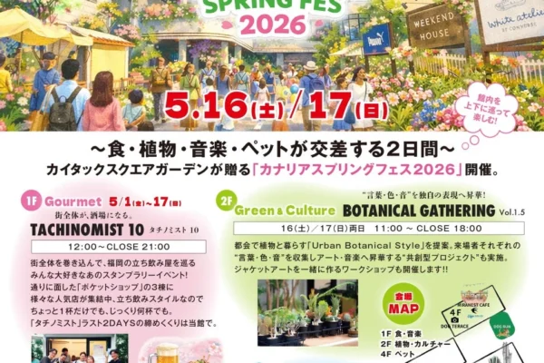 カイタックスクエアガーデンでは、ゴールデンウィークから初夏にかけて、福岡の感性を刺激する多彩な企画が用意されています。ここでしか味わえない体験を通して、日常を彩る新しいライフスタイルを発見する機会となるでしょう。