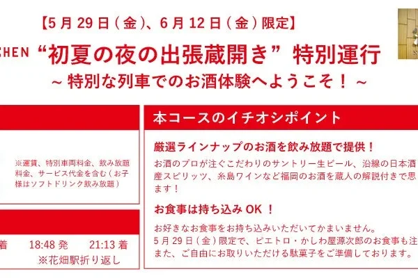 西日本鉄道が運行する、地域を味わう旅列車「THE RAIL KITCHEN CHIKUGO」は、2026年5月29日(金)および6月12日(金)に、「THE RAIL KITCHEN CHIKUGO”初夏の夜の出張蔵開き”特別運行」を開催することを発表しました。この特別な運行は、福岡の豊かな酒文化を列車内で体験できるユニークな企画であり、多くの酒愛好家から注目を集めています。
